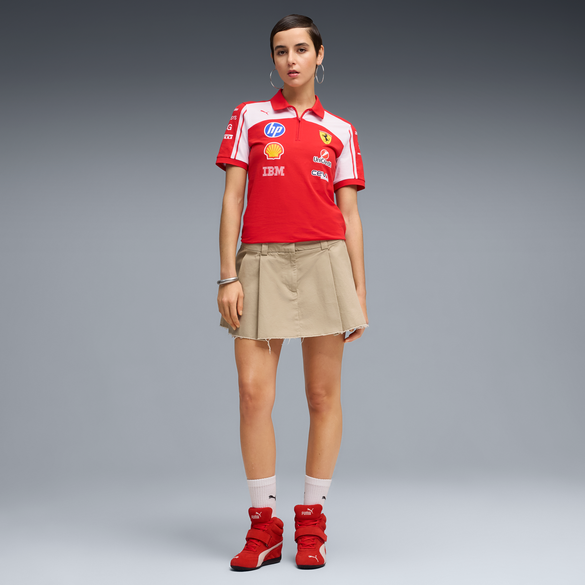 Support Ferrari in style with the Scuderia Ferrari F1 Team 2026 Polo for women in red. This official team polo features a classic collar, breathable fabric, and Scuderia Ferrari F1 branding, perfect for race days, casual wear, or motorsport-inspired everyday style.