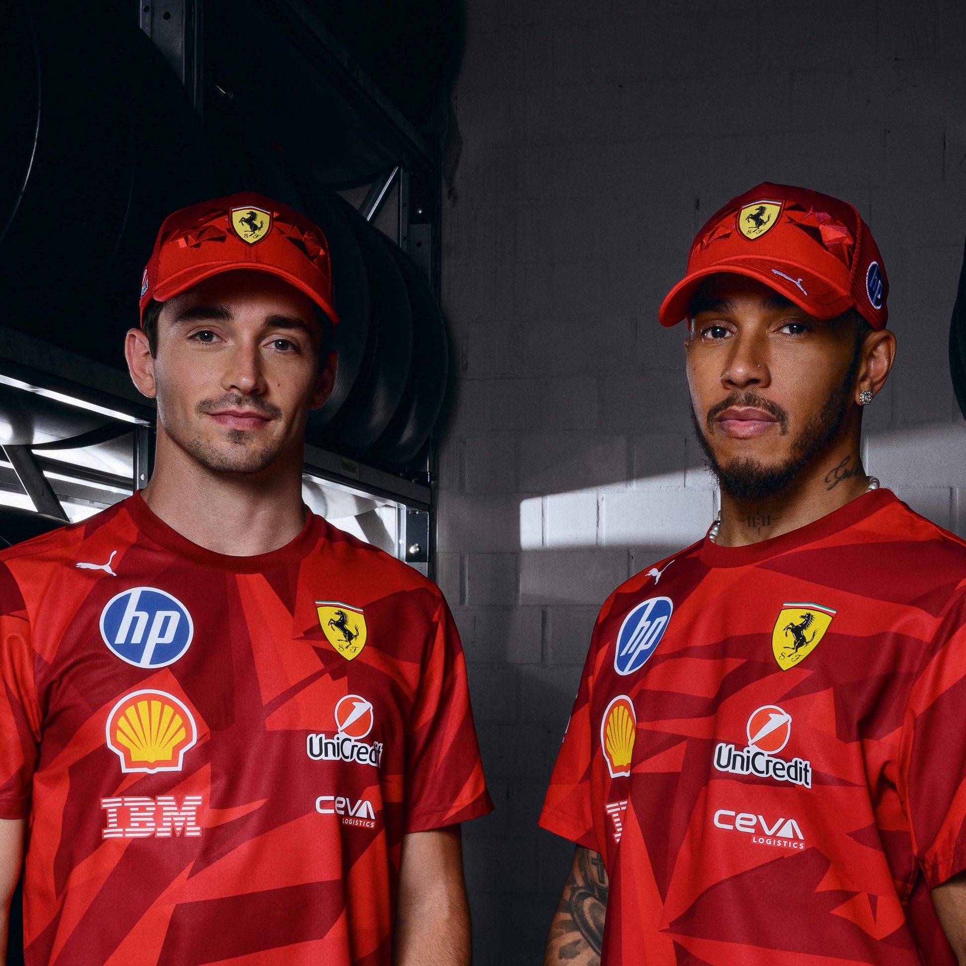 Special edition PUMA Scuderia Ferrari Team Cap, launched to coincide with the 2025 Las Vegas Grand Prix. As worn by Lewis and Charles across the Formula 1 race weekend, in a special one-off design with all the official Ferrari and PUMA branding.