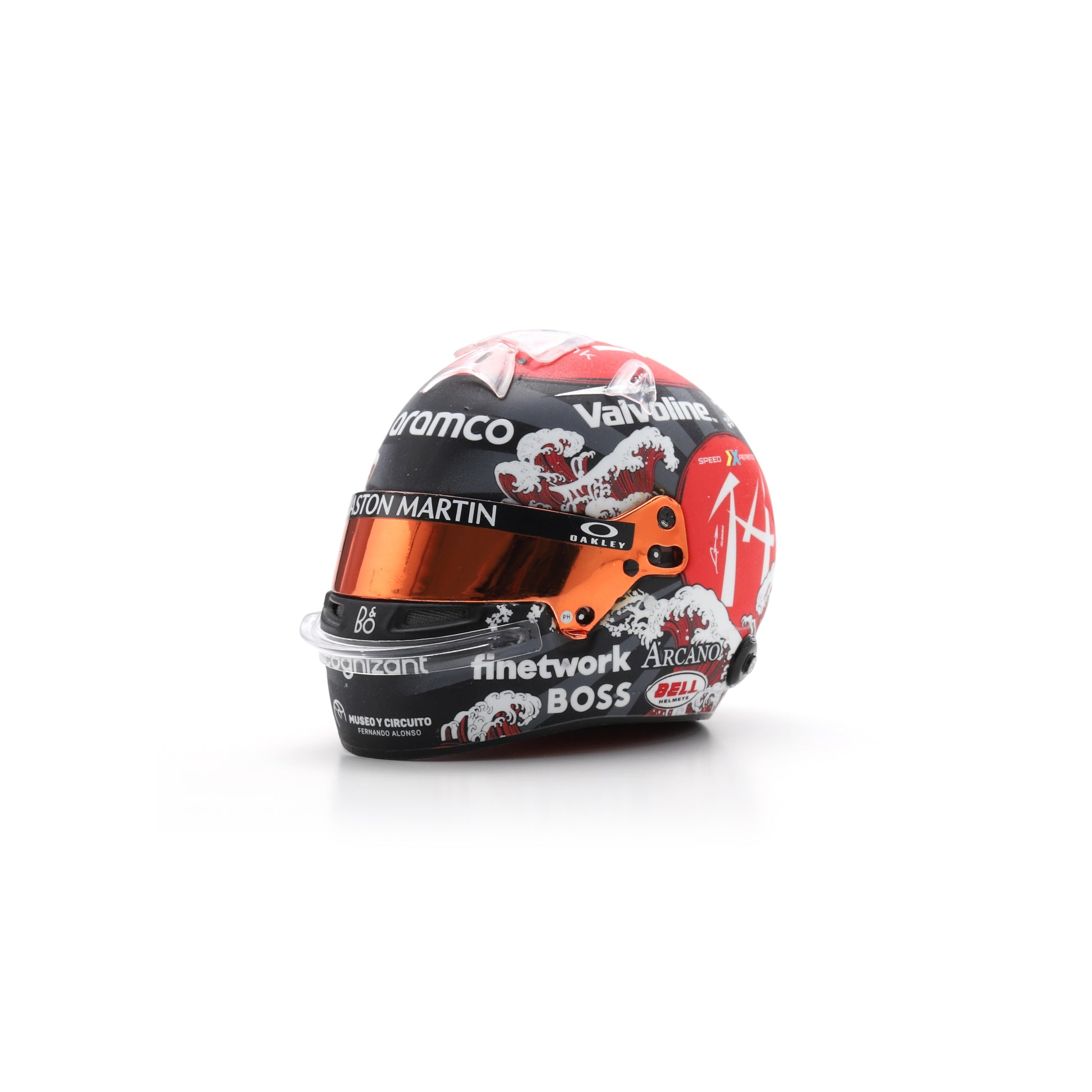 Commemorate the 2024 Japanese Grand Prix with this Spark 1:5 scale replica helmet of Fernando Alonso, capturing the unique special-edition design worn by the two-time World Champion at Suzuka. Featuring the striking black, red, and white colourway with Japanese wave motifs, this model showcases every intricate sponsor detail including Aston Martin, Aramco, and Valvoline.